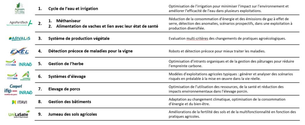 Répartis un peu partout en France, ces démonstrateurs permettront d’envisager des simulations à différentes échelles spatiales, depuis une parcelle jusqu’aux interactions des exploitations avec leur environnement, et temporelles, de recommandations quotidiennes à des projections pluriannuelles. Ils faciliteront la création de fermes types, démontrant la valeur ajoutée des jumeaux numériques pour prendre des décisions tactiques et stratégiques dans un contexte de transition agroécologique : optimisation de la gestion des ressources (eau, énergie, engrais), préservation de la fertilité des sols, détection précoce des maladies, évaluation de la réduction de l’empreinte carbone, etc.